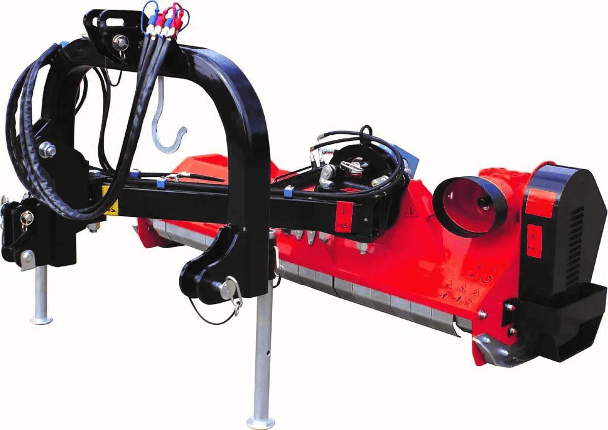 . Attelage 3 points cat. 1, boîtier fonte 540 tours roue libre, denture marteaux montée sur boulon ,orientation hydraulique de la tête de broyage +90° -50°, déport 70 cm de l’axe du tracteur, rouleau arrière réglable, sécurité mécanique sur l’attelage, tendeur automatique de courroies, graissage centralisé, patins réglables, 3 courroies, cardan simple homocinétique