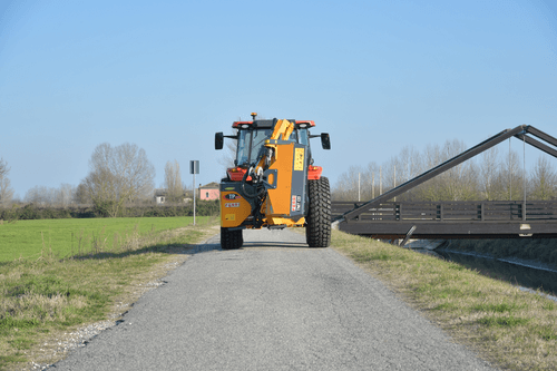 Portée horizontale : 4,82 m. Pièces d'articulation estampées moulées. Axes traités montés sur bagues bi-métal. Système anti basculement. Suspension oléopneumatique. Pivot arrière 115°. Groupe de broyage 1,25 m TNIT avec entraînement par courroies, équipé de couteaux polyvalents. Refroidisseur d'huile de série. Commande électronique progressive EG-Tronic avec gestion électrique du rotor.