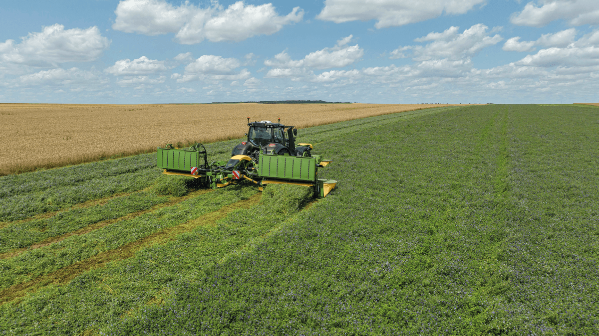 Faucheuse 4,50 m, équipée de série du système unique sur le marché de transfert de charge automatique...