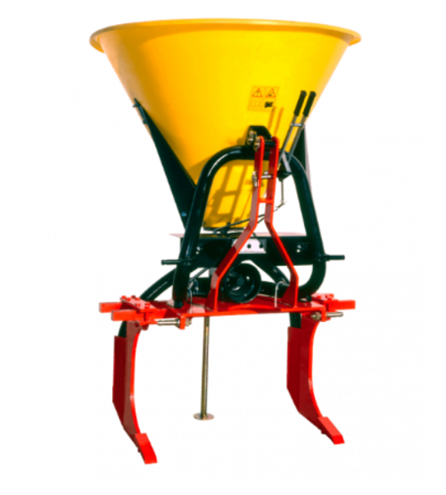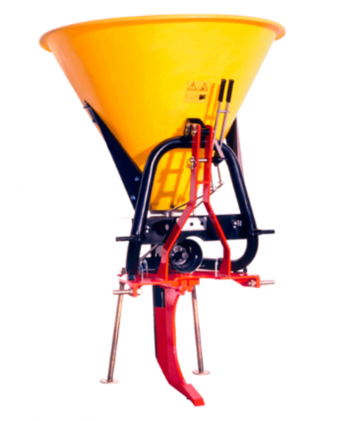 3 - Distributeur d'engrais à disque DC 6 - 18 M porté à épandage par disque à ailettes, cuve polyéthylène roto-moulée, fond de cuve et distribution ouverture, fermeture INOX, disque d'épandage acier, réglage de débit et d’ouverture par levier . châssis en tube d'acier protection par peinture thermo durcie en polyester ou galvanisé à chaud, largeur d ’épandage de 6 à 24 mètres, livré avec agitateur, grille de protection et cardan.