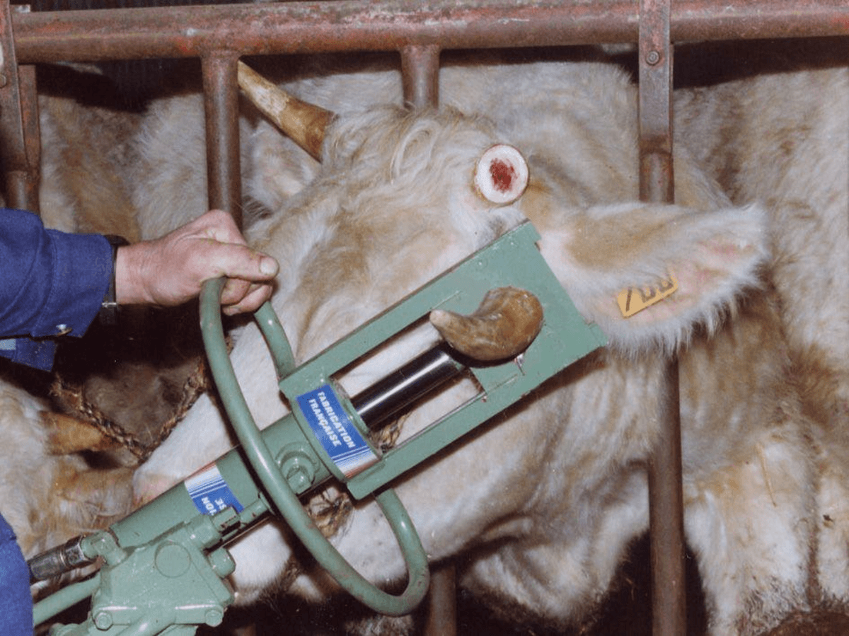 Une écorneuse à bovin hydraulique afin de sectionner, sans bruit, les cornes pour éviter le stress des animaux, et ce de façon rapide. La corne passe entre 2 couteaux dont un fixe et un mobile et permet une coupe franche et rapide par un précepte de guillotine. Parfait pour diminuer les menaces de blessures lorsque que l’éleveur conduit les bovins pour l’insémination ou pour l’alimentation.
