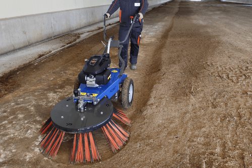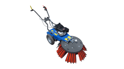 Balai polypropylène Ø 100 cm inclinable gauche ou droite, version tractée, 2 sens de rotation, moteur Honda, roues gonflables. Existe aussi en version poussée, 2 autres types de balai (acier enrobé, polypropylène/acier enrobé).