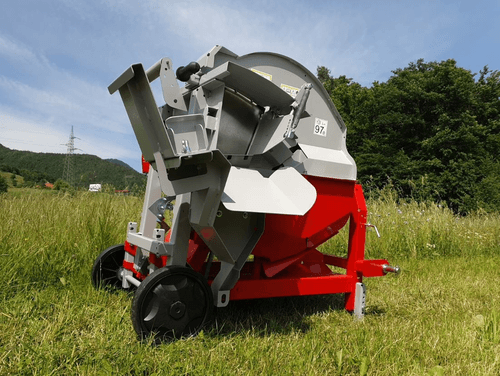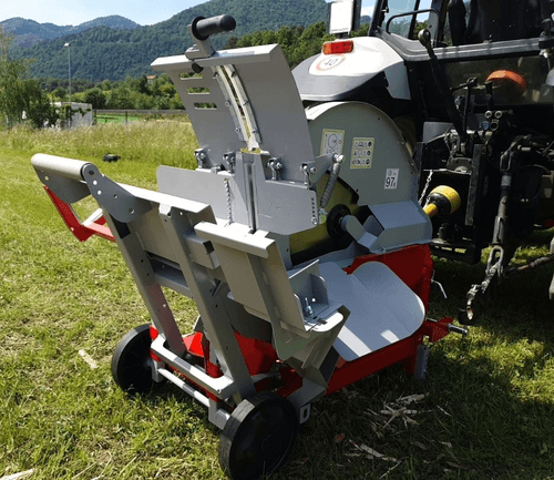 Scie circulaire à chevalet avec tapis monte bois. PDF tracteur 380 tr/min, tapis longueur 5 m, hauteur...