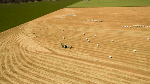 Enrubanneuse traînée double satellites, chargement dans le sens d'avancement de la presse. Table d'enrubannage fractionnée permettant un chargement et un déchargement simultanés de la balle. Ø de balle jusqu'à 1,5m et poids maxi 1 400kg.