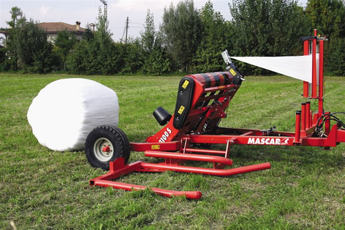 Enrubanneuse traînée double satellites, chargement dans le sens d'avancement de la presse. Table d'enrubannage...