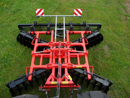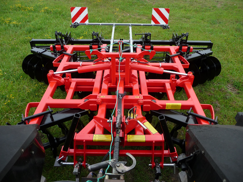 Disques crantés avant et lisses arrière diamètre 610 mm, écartement 230 mm.