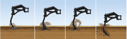 L'écartement entre les dents de 230 mm permet d'avoir plus de dents, des petites bandes de terre sont ainsi tracée ce qui demande moins d'effort de traction et donc réduit la consommation de ce chisel.