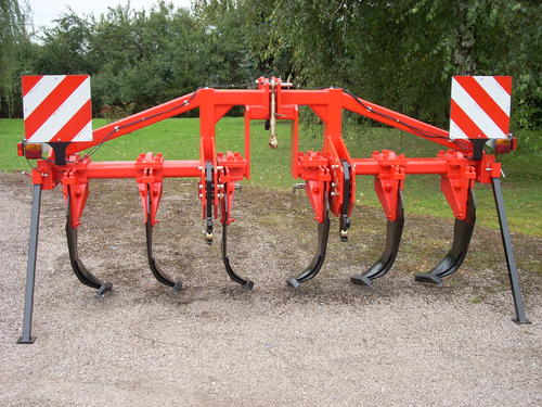 Disponible de 3 à 7 dents, épaisseur 30 mm, soc sabot en acier traité, dégagement sous châssis 750 mm. Sécurité par boulon de cisaillement. 2 roues de terrage pneumatiques, réglage par vis.