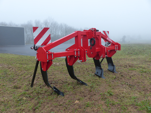 1 dent droite, épaisseur 30 mm, soc sabot en acier traité, dégagement sous châssis 900 mm. Sécurité par boulon de cisaillement. Poids 244 kg. Largeur de travail 1,1 m, 1 dent.