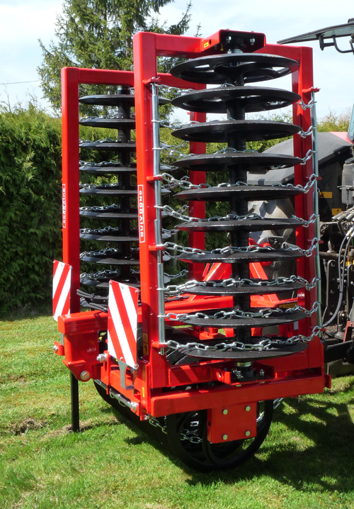 Equipé d’un attelage 3 points en chape poussé directionnel catégorie 2, anneaux fonte de 700 mm de diamètre à branches incurvées, angle 45°, décrottoirs à chaines.