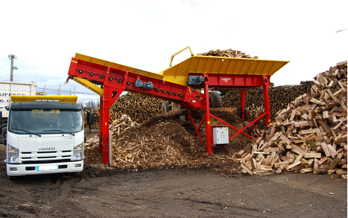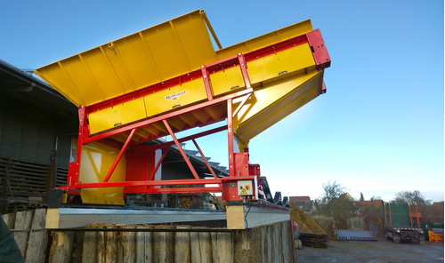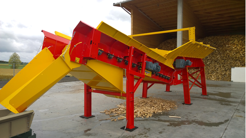 Grande surface de criblage de 4x1 m, le chargement se fait par déversement godet ou en sortie de combiné scieur/fendeur.