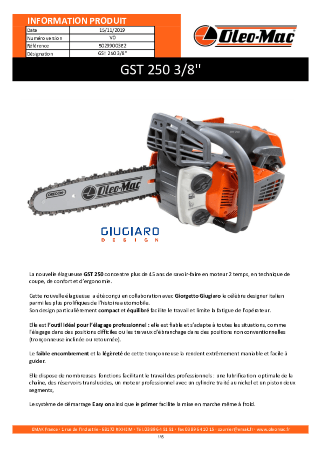 Elagueuse thermique professionnelle. GST 360. Moteur Emak. Cylindrée 35,1 cc. 1 cylindre 2 temps EURO...