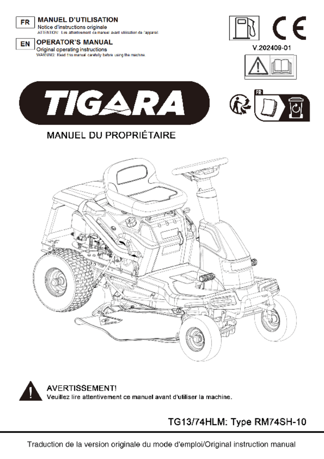 - Tondeuse autoportée RIDER TG 13/74 HLM