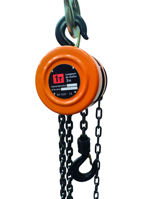 Palan à chaîne standard avec linguet de sécurité. Modèle professionnel. Acier. Engrenages très résistants aux chocs. Crochet tournant sur 360°. Usage régulier. 1 T - 3 m - 9,5 Kg. Diamètre maillon : 6 mm.