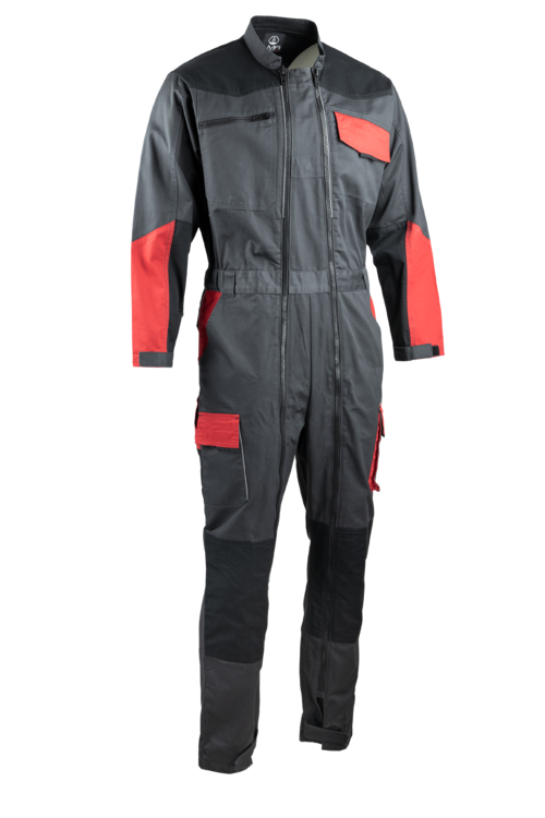 Col officier, 2 poches poitrine zippées dont une à ouverture verticale, bas de manches et bas de jambes resserrables par patte avec bande auto agrippante, ceinture 4 passants élastiquée côtés et dos, 2 soufflets d'aisance dos, 2 poches main + ouvertures passe-mains, 1 poche plaquée dos avec rabat, 1 grande poche plaquée cuisse gauche fermée par rabat, 1 poche téléphone plaquée fermée par rabat, 1 poche mètre bicolore, empiècements contrastants de renfort genoux, systèmes easy feet et flexi top.